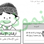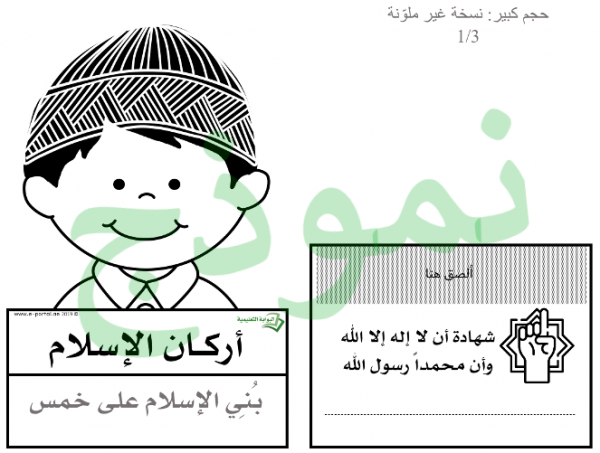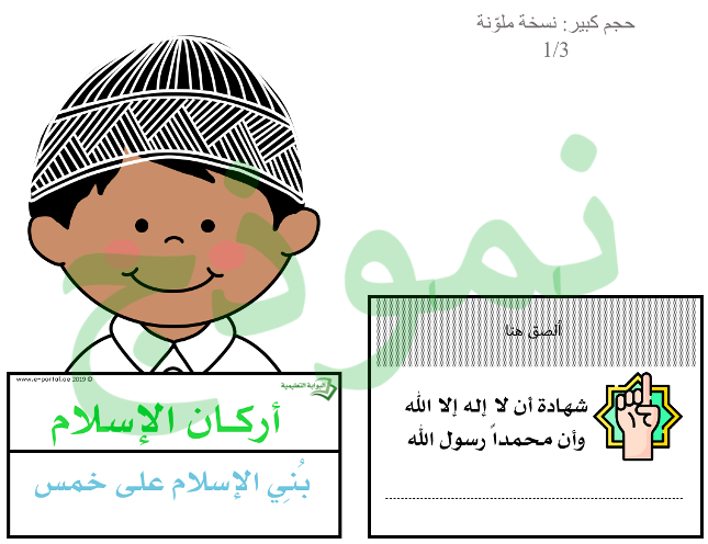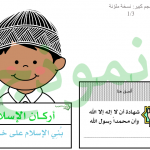 اصنع كتيباً لأركان الإسلام مكون من خمس صفحات مع الغلاف بحجم A5. اطبع الملف وسيقوم الطالب بقص أوراق الكتيب الخمسة ولصقها بالتسلسل. يبدأ بوضع الصمغ على الورقة الأطول ثم يلصق عليها الورقة الأصغر بالأصغر وهو الغلاف، ثم يكتب المعلومات على الخط في كل صفحة. الهدف من هذا النشاط هو أن يتمكن الطالب من كتابة أركان الإسلام الخمس.