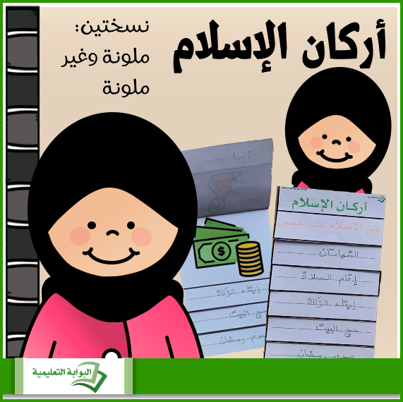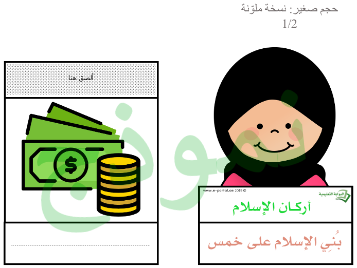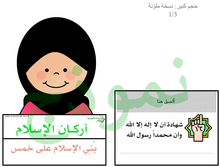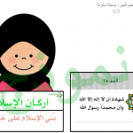 اصنع كتيباً لأركان الإسلام مكون من خمس صفحات مع الغلاف بحجم A5. اطبع الملف وسيقوم الطالب بقص أوراق الكتيب الخمسة ولصقها بالتسلسل. يبدأ بوضع الصمغ على الورقة الأطول ثم يلصق عليها الورقة الأصغر بالأصغر وهو الغلاف، ثم يكتب المعلومات على الخط في كل صفحة. الهدف من هذا النشاط هو أن يتمكن الطالب من كتابة أركان الإسلام الخمس.