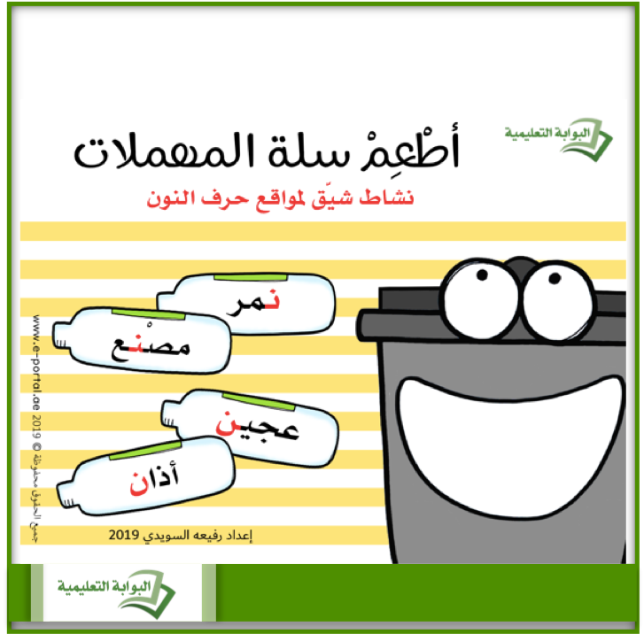 نشاط شيّق لتعلم مواقع حرف النون، في أول الكلمة، وسط الكلمة، آخر الكلمة متصلة، آخر الكلمة منفصلة. الهدف من هذا النشاط: أن يتمكن الطالب من تحديد موقع الحرف عن طريق اختيار البطاقة الصحيحة.