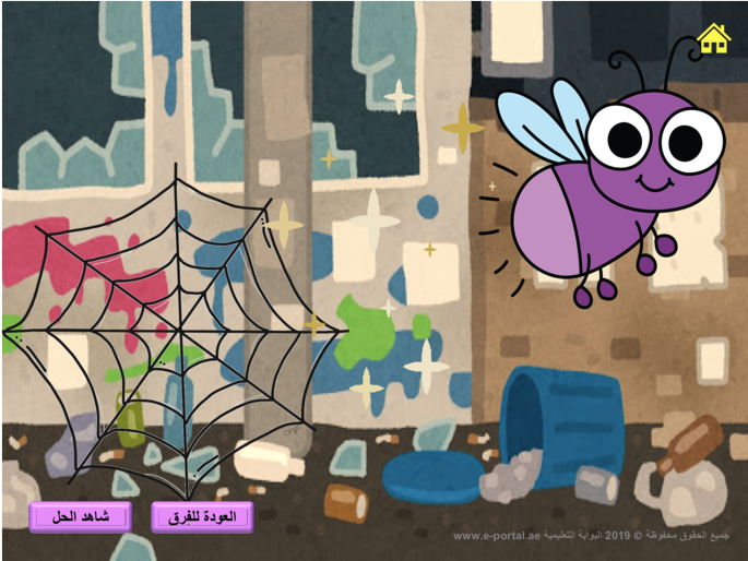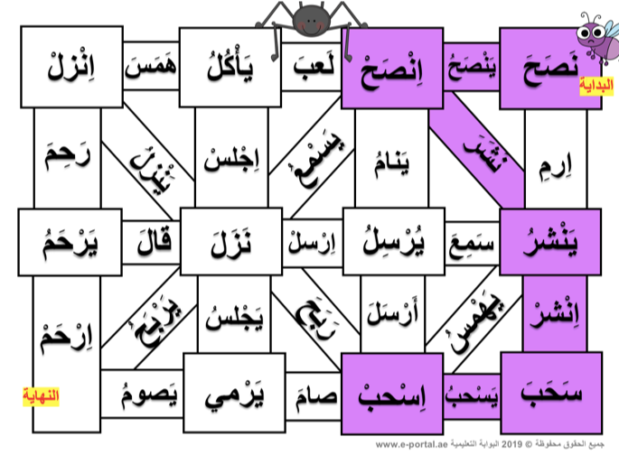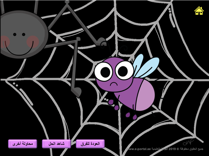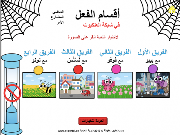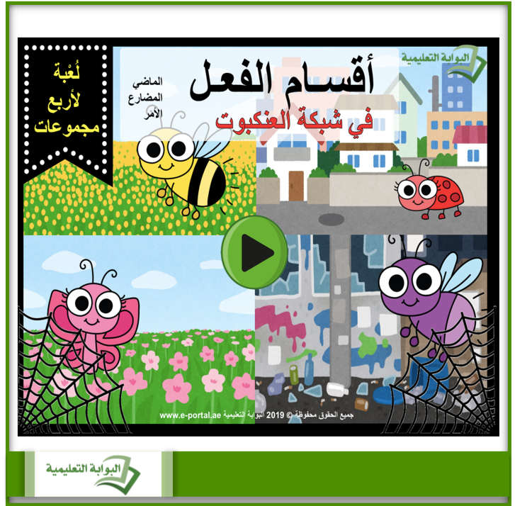الهدف من اللعبة: أن يتمكن الطالب من تحديد أقسام الفعل الواحد (ماضي، ومضارع، وأمر)، حتى يساعد الحشرة في الفرار من العنكبوت.