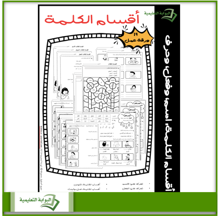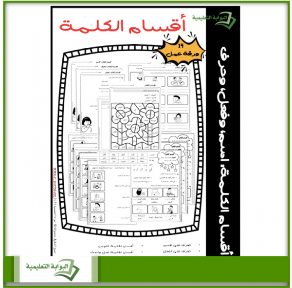 أوراق عمل في درس أقسام الكلمة: الاسم، والفعل، والحرف. تتكون هذه الحزمة من 14 ورقة عمل غير ملوّنة. تتنوع الأسئلة كالآتي: