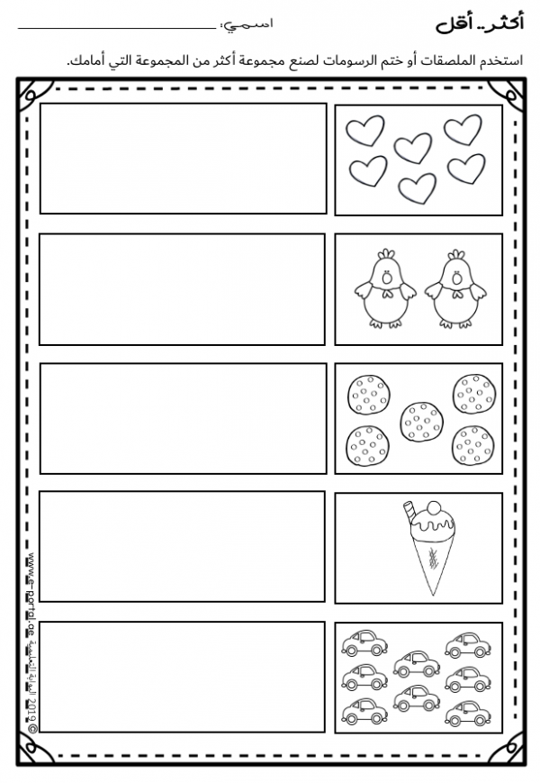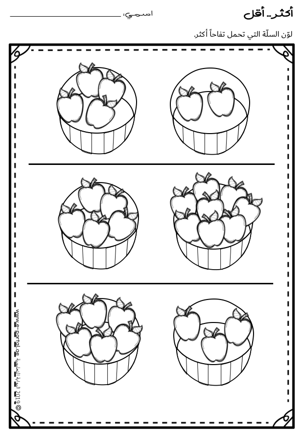 تذكر أنه من الضروري وقبل ممارسة هذا النشاط استخدام المحسوسات كالألعاب وأدوات العد “الدببة، أو المكعبات” لإنشاء مجموعتين مختلفتين في الكمية، فيقوم الطالب بعد المجموعتين وتحديد أيهما أكثر وأيهما أقل.