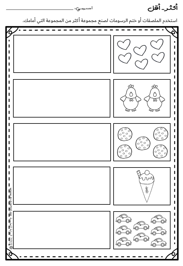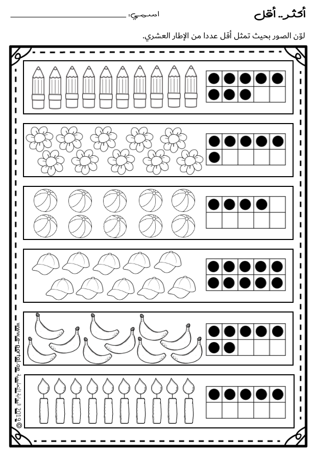 - 10 بطاقات مصوّرة للعد والمقارنة.