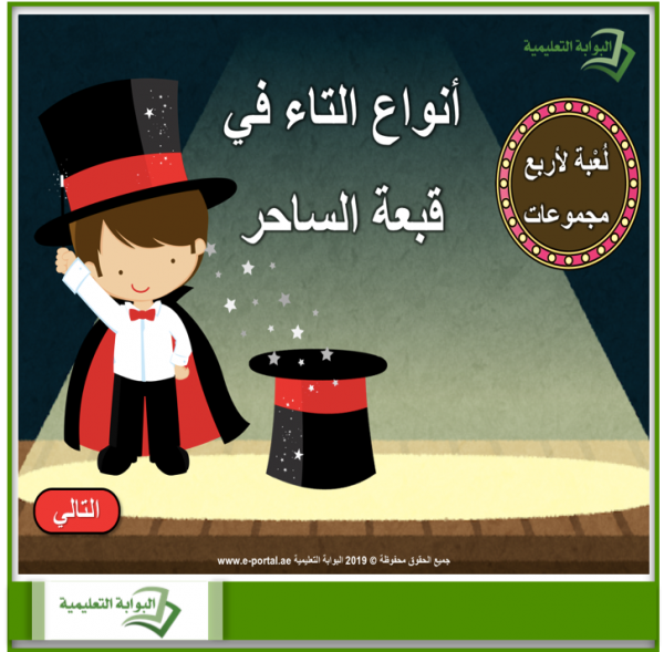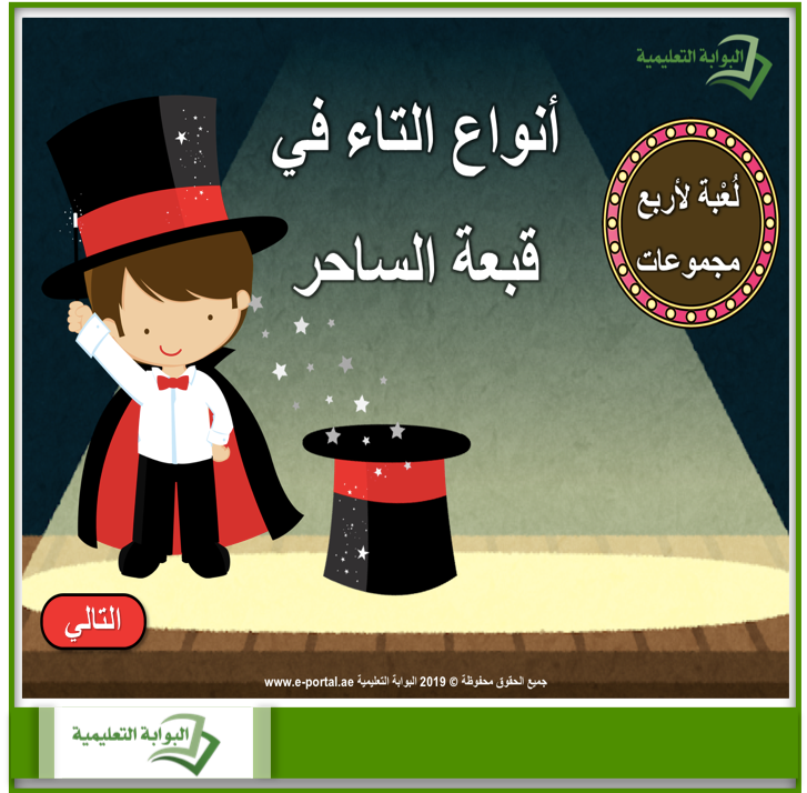 أنواع التاء في قبعة الساحر، لعبة تعليمية ممتعة في اختيار نوع التاء إن كانت مفتوحة أو مربوطة. اللعبة تتألف من 22 صورة تنتهي بحرف التاء. طريقة اللعب تجدها في الملف.