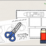 كل ورقة تلوين تضم مجموعة من الرسومات، وعلى الطفل تلوينها، وقصها، ثم لصقها على ورقة جدول اللون.