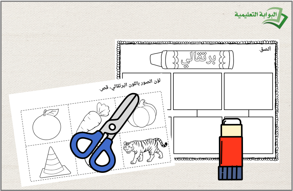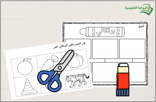 10 أوراق في تلوين، وقص، رسومات للألوان، وهي: “اللون الأخضر، الأصفر، البرتقالي، البني، الأحمر، الوردي، البنفسجي، الأزرق، الرمادي، الأسود” مع 10 أوراق للصق الرسومات عليها وفق اللون.
