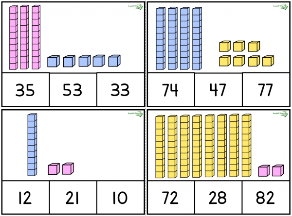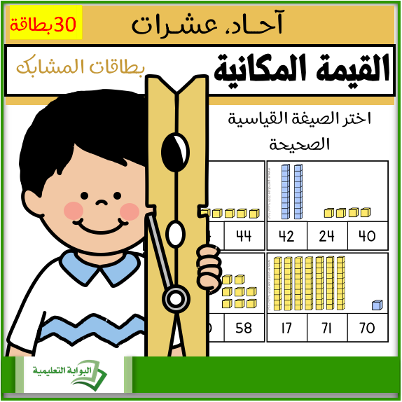 القيمة المكانية باستخدام المشابك، لعبة تعليمية في الرياضيات مكونة من 30 بطاقة في البحث عن الصيغة القياسية للشكل الموجود في البطاقة والمكوّن من آحاد، وعشرات،.
