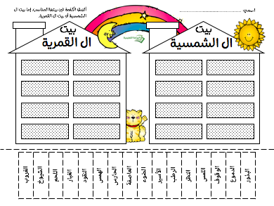 مجموعة أوراق عمل في تصنيف الكلمات التي تحتوي إما على ال الشمسية أو ال القمرية. المجموعة مكونة من نسختين، نسخة ملوّنة تضم 8 أوراق عمل ونسخة غير ملونة، على الطالب قص الكلمات الموجودة في أسفل الورقة ولصقها في البيت المناسب. يُمارس هذا النشاط فردي أو جماعي.