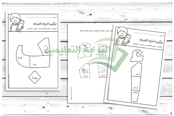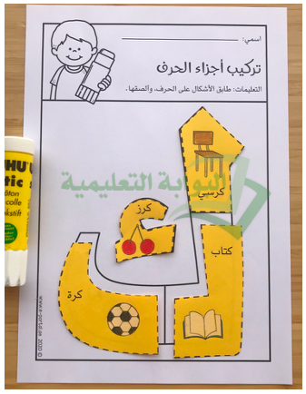 هذا النشاط يعد مناسباً لطلابك في بداية تعلم أشكال حروف الهجاء وأصواتها، فلكل جزء من أجزاء الحرف صورة تبدأ بصوت الحرف، كما أنها مثالية لجعل طلابك يمارسون المهارات الحركية الدقيقة من خلال القص واللصق.