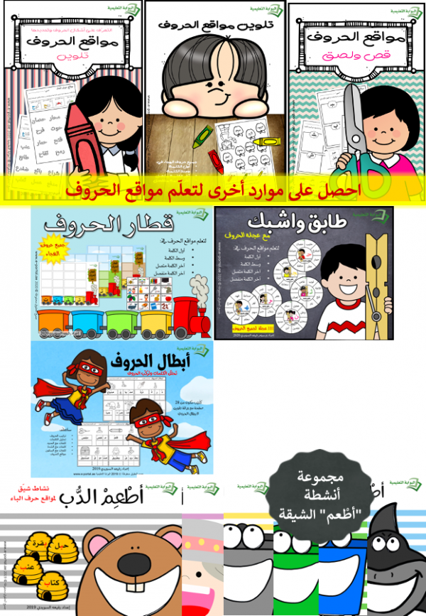 أوراق عمل في تلوين الكلمات التي تحتوي على الحرف في مختلف المواقع لجميع حروف الهجاء وعددها 28. الهدف من النشاط: أن يتمكن الطالب من تحديد موقع الحرف في الكلمة من خلال تلوينه باللون المطلوب.