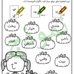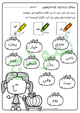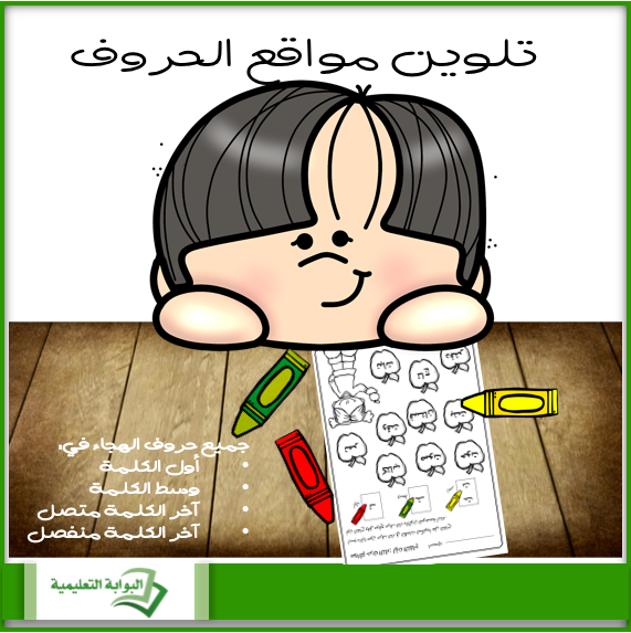 أوراق عمل في تلوين مواقع الحروف لكلمات تحتوي على الحرف المراد تعلمه في مختلف المواضع، الحرف في أول الكلمة، وفي وسط الكلمة، وفي آخر الكلمة متصل، وفي آخر الكلمة منفصل. الهدف من النشاط: أن يتمكن الطالب من تمييز شكل الحرف الموجود في الكلمة من خلال تلوين الكلمة وفق اللون المطلوب لكل موضع.