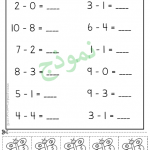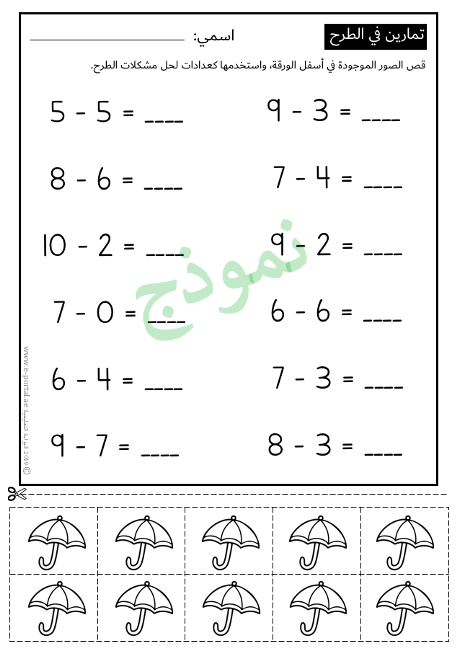 يحتوي هذا النشاط على 10 صفحات تدريب لتدريس وتقوية الطالب في حل مشكلات الطرح ضمن العدد 10. توجد عدادات في أسفل كل صفحة، وهي عبارة عن رسومات تساعد الطالب في ايجاد الناتج. لذا، على الطالب قص هذه الرسومات التابعة لورقة النشاط واستخدامها كعدادات لحل عملية الطرح.