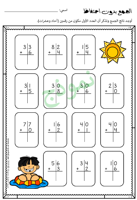 أوراق عمل في الجمع العمودي وتحديداً جمع عددين مكونين من رقمين، الملف مكوّن من 24 ورقة عمل، وهي كالآتي:
