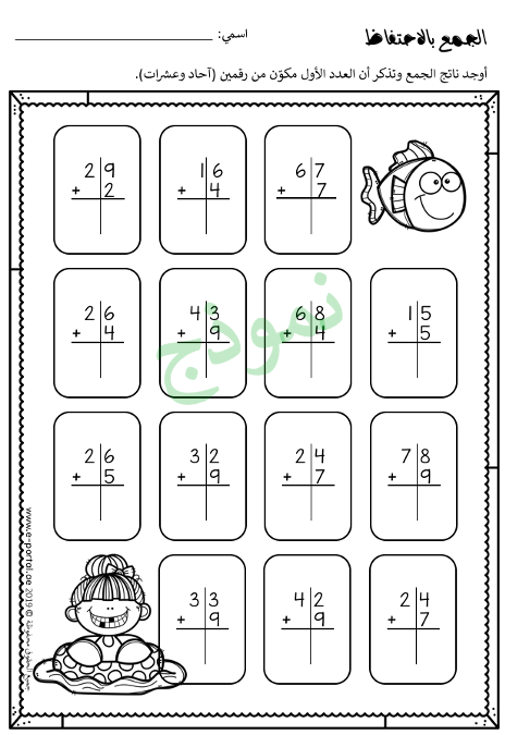 - ورقتي عمل “الجمع بالاحتفاظ وبدون احتفاظ” ملوّنة.