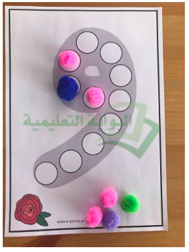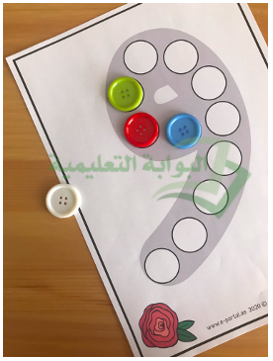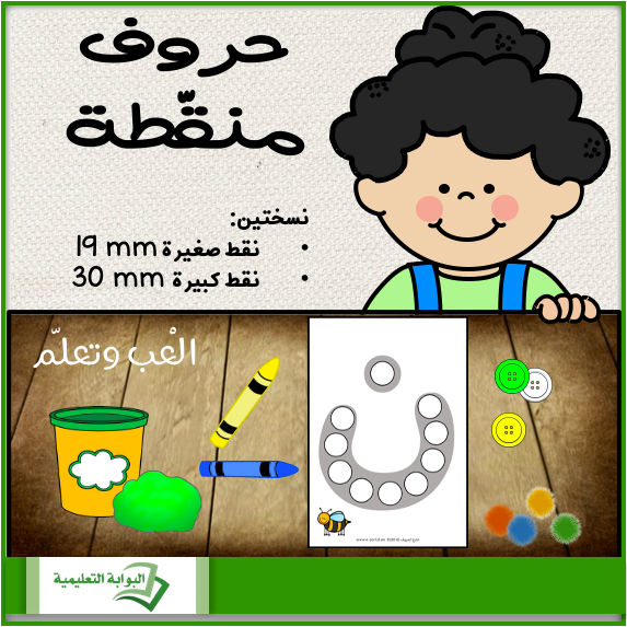 الهدف من هذا النشاط هو أن يتعرّف الطالب على شكل الحرف من خلال ملء النقط المجوّفة الموجودة على الحرف. ما عليك سوى طباعة الورقة وتغليقها حرارياً وتوفير أحد هذه الأدوات: صلصال، أو ألوان، أو أزرار، أو كرات الصوف.