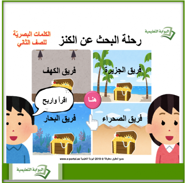 رحلة البحث عن الكنز هي النسخة الإلكترونية للعبة اقرأ واربح، لعبة ممتعة وشيّقة في تعلّم قراءة الكلمات البصرية اللعبة مخصصة لأربع مجموعات من الطلاب وكل مجموعة قد ذهبت في رحلة للبحث عن الكنز.