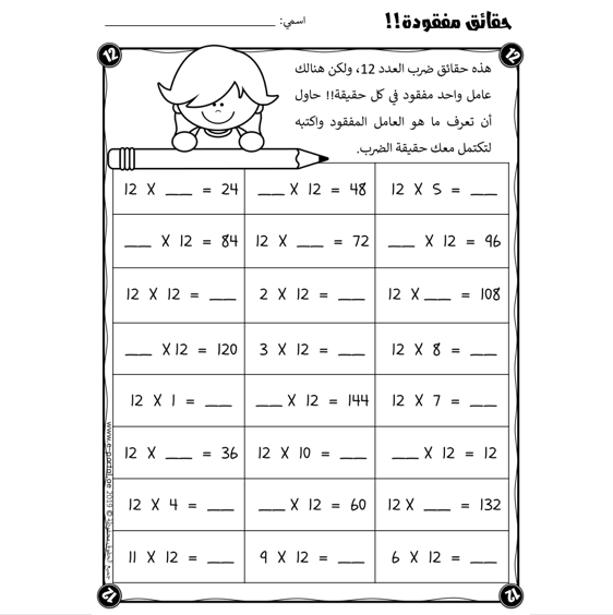جدول ضرب العدد اثنى عشر عبارة عن مجموعة مكونة من 10 أوراق عمل تم تصميمها لمساعدة الطلاب على ممارسة وتعلم وإتقان حقائق الضرب بطريقة ممتعة وجذابة ومُبسّطة. جميع الأوراق غير ملوّنة وبحجم A4.