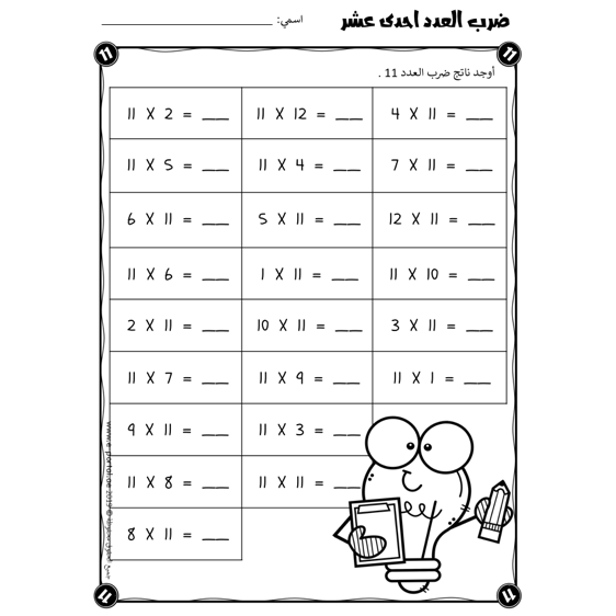 جدول ضرب العدد احدى عشر عبارة عن مجموعة مكونة من 10 أوراق عمل تم تصميمها لمساعدة الطلاب على ممارسة وتعلم وإتقان حقائق الضرب بطريقة ممتعة وجذابة ومُبسّطة. جميع الأوراق غير ملوّنة وبحجم A4.