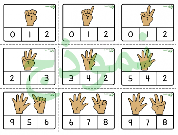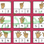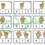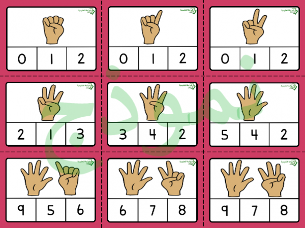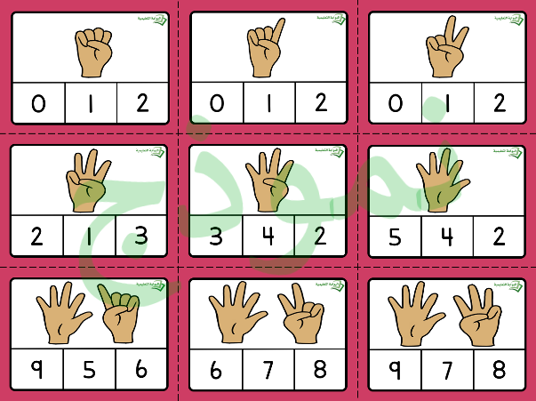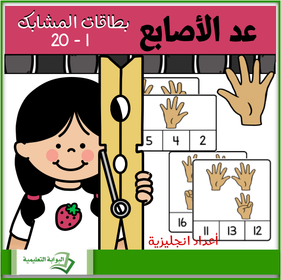 عد الأصابع واستخدام المشابك، لعبة تعليمية لركن الرياضيات مكونة من 21 بطاقة في العد من العدد 1 وحتى العدد 20. وهي عبارة عن بطاقات مصوّرة مع أعداد. على الطالب أن يعد الأصابع من ثم يضع المشبك على العدد الصحيح من بين الأعداد.