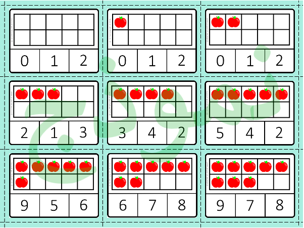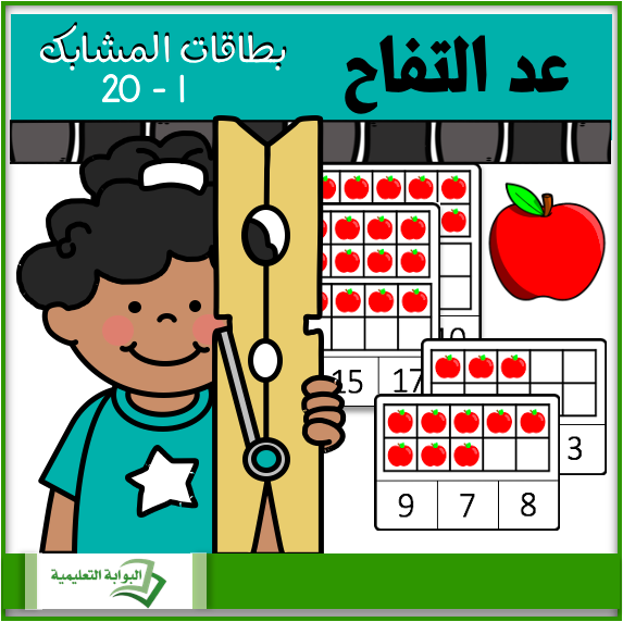 عد التفاح وحدّد الناتج باستخدام المشابك، لعبة تعليمية لركن الرياضيات مكونة من 21 بطاقة في عد كمية التفاح الموجودة على البطاقة. من العدد 1 وحتى العدد 20.الهدف من هذه اللعبة: أن يتمكن الطالب من عد التفاح الموجود على البطاقة وتحديد رمز العدد الصحيح عن طريق وضع المشبك عليه.