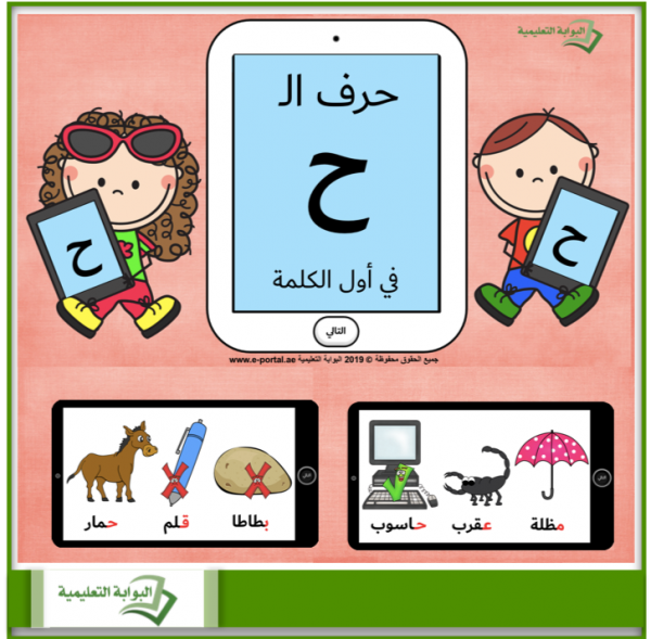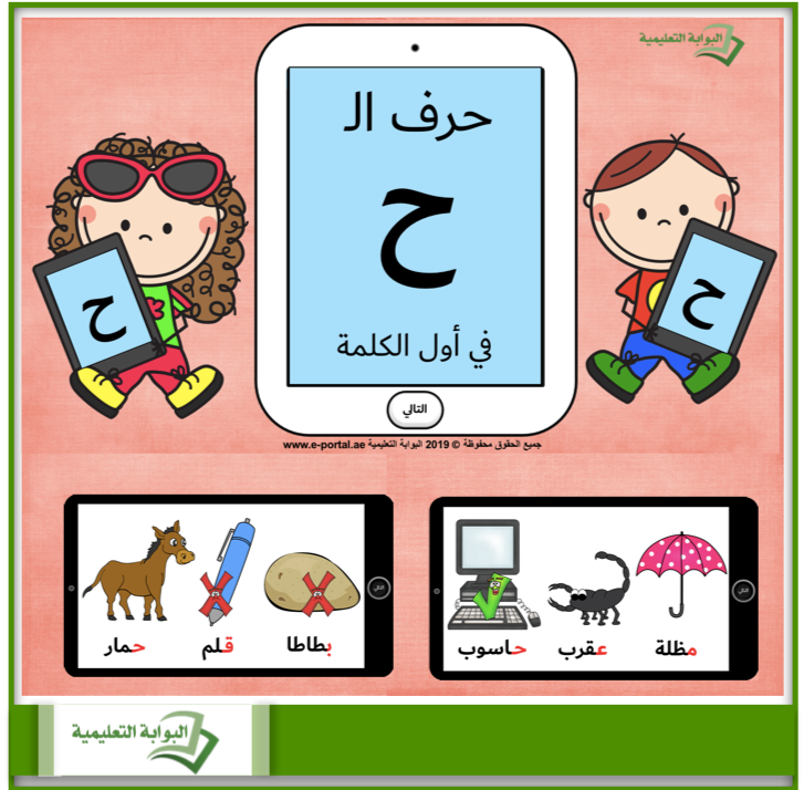 - يضم هذا العرض 9 شرائح وفي كل شريحة 3 صور مع أسماءها، وعلى الطالب أن يستخرج فقط الصورة التي يبدأ اسمها بصوت الحرف ح.