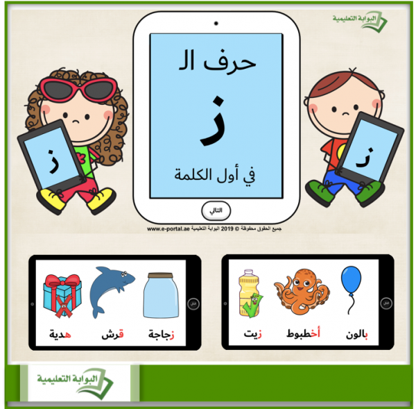- يضم هذا العرض 9 شرائح وفي كل شريحة 3 صور مع أسماءها، وعلى الطالب أن يستخرج فقط الصورة التي يبدأ اسمها بصوت الحرف ز.