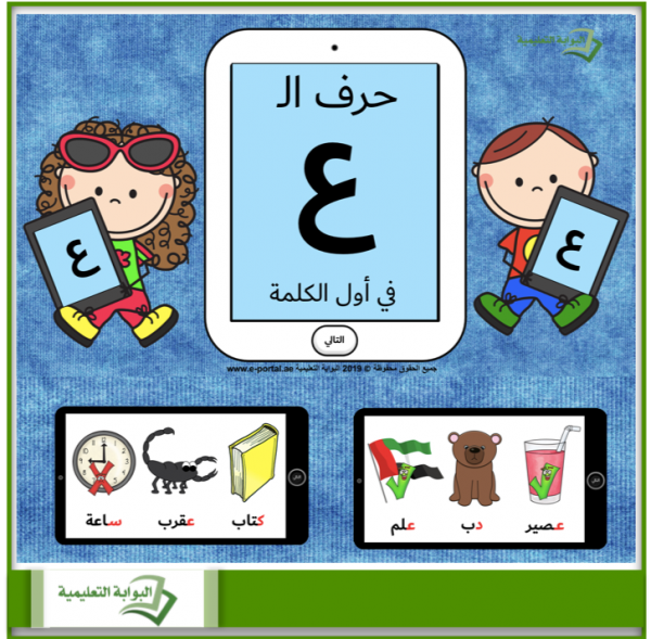 - يضم هذا العرض 10 شرائح وفي كل شريحة 3 صور مع أسماءها، وعلى الطالب أن يستخرج فقط الصورة التي يبدأ اسمها بصوت الحرف ع.