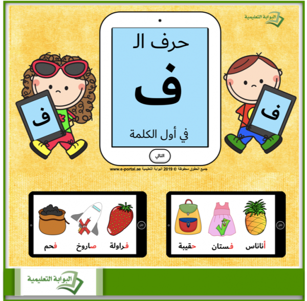 - يضم هذا العرض 10 شرائح وفي كل شريحة 3 صور مع أسماءها، وعلى الطالب أن يستخرج فقط الصورة التي يبدأ اسمها بصوت الحرف ف.