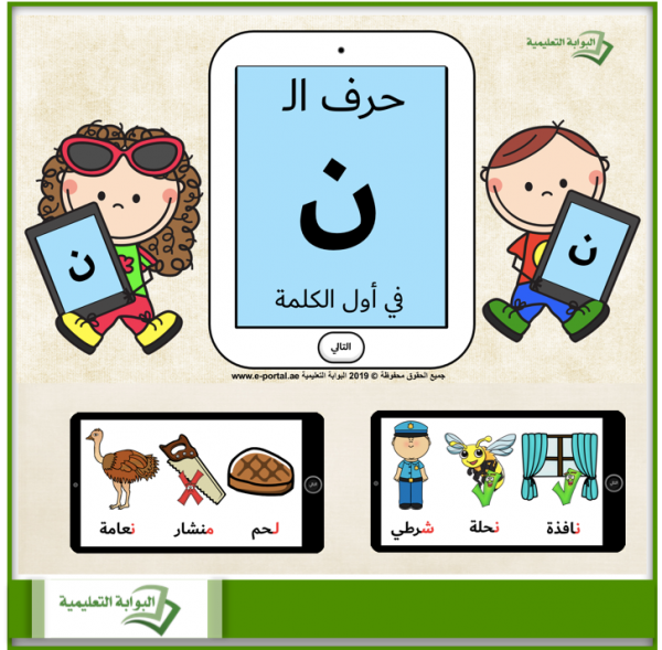 عرض تقديمي مميّز لحرف النون في أول الكلمة، يمكن للمعلم عرضه في بداية الدرس كتمهيد أو في نهاية الدرس كمراجعة للطلاب.