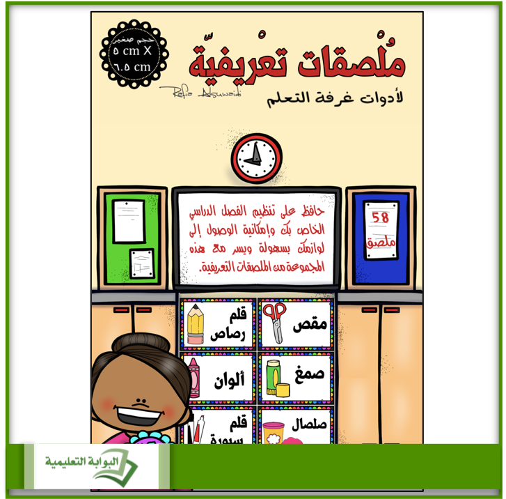 يتكون هذا الملف من 58 بطاقة تعريفية بالصور الملوّنة مع أسماءها، والتي تتيح للطالب في تهجئة وقراءة اسم الأداة. حجم البطاقة الواحدة (5 cm X 6.5 cm)، فهي مناسبة للعلب الصغيرة. ما عليك سوى طبع البطاقات على الملصقات البيضاء وألصقها على العلبة المناسبة!! أو اطبعها على ورق أبيض وغلفها حرارياً لتدوم طويلاً ثم ألصقها!!