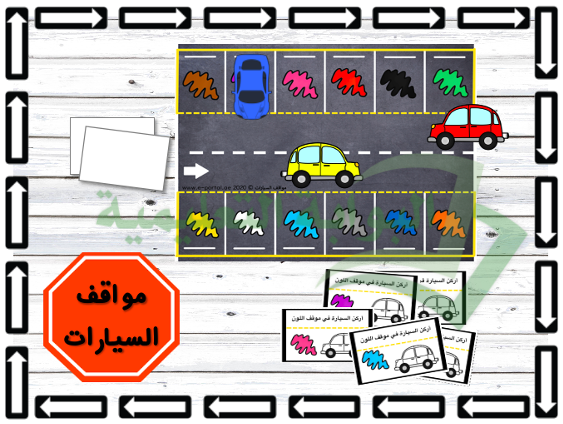 الهدف من النشاط: أن يتمكن الطالب من التعرف على اسم اللون الموجود في البطاقة ومطابقته بموقف السيارة الذي يحمل نفس اللون من خلال صف السيارة في الموقف الصحيح.