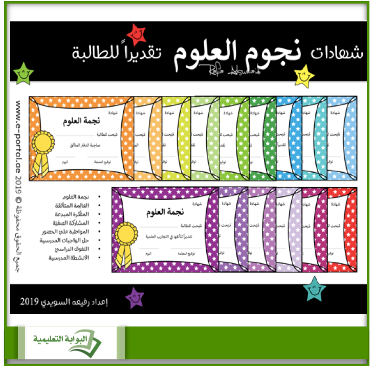 يختلف أسلوب المعلمة في تقدير عمل وجهد الطالبة بشتى الوسائل، منها الكوبونات والملصقات والجوائز وكذلك شهادات التقدير. نوفّر لكِ في هذا الملف مجموعة رائعة من شهادات التقدير وتحديداً في مادة العلوم لتعزيز مواظبة الطالبة على التميز والتفوق.