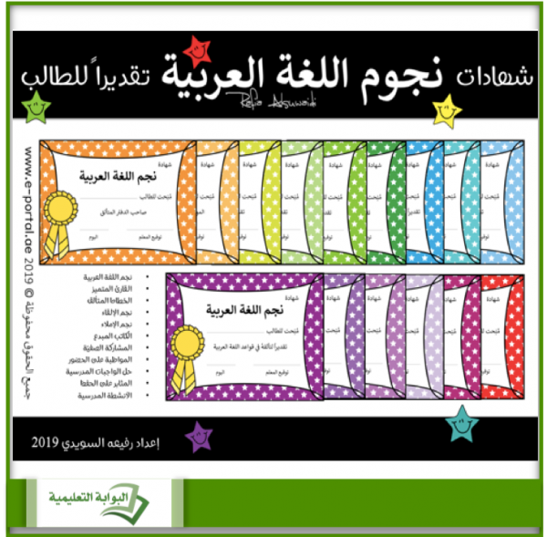 يختلف أسلوب المعلم في تقدير عمل وجهد الطالب بشتى الوسائل، منها الكوبونات والملصقات والجوائز وكذلك شهادات التقدير. نوفّر لك في هذا الملف مجموعة رائعة من شهادات التقدير وتحديداً في مادة اللغة العربية والتي من خلالها تُعزز مواظبة الطالب على تميزه وتفوقه.