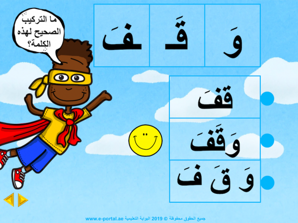 الهدف من النشاط: أن يتمكن الطالب من تحديد التركيب الصحيح لحروف الكلمة من بين الخيارات المتاحة.