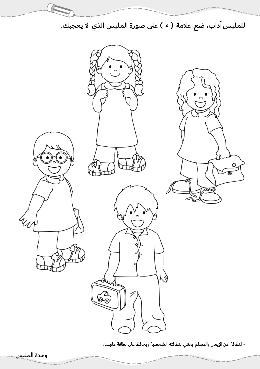 هذا الملف خاص بوحدة الملبس يحتوي على تدريبات متنوّعة ومفيدة في 6 صفحات غير ملوّنة.