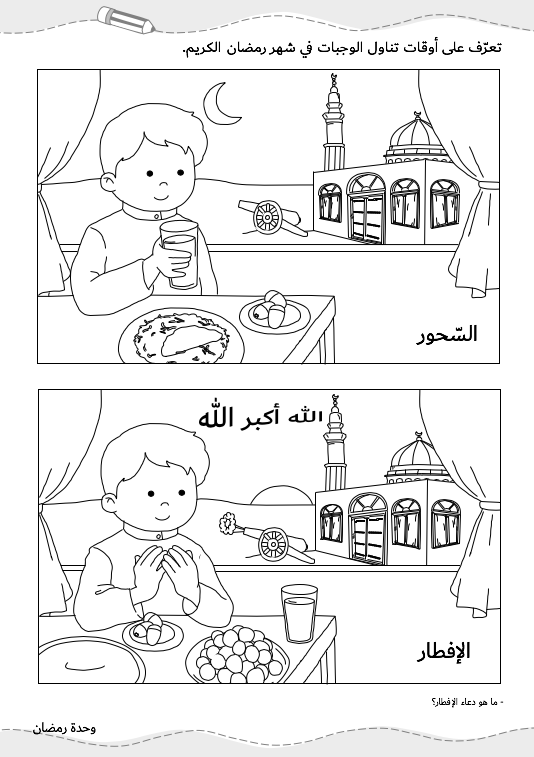 هذا الملف خاص بوحدة رمضان يحتوي على تدريبات متنوّعة ومفيدة في 5 صفحات غير ملوّنة.