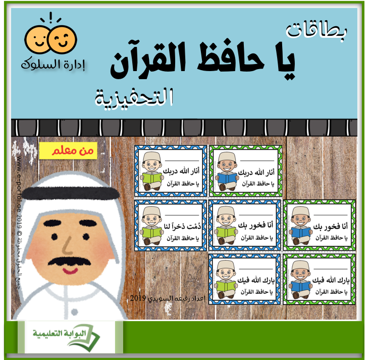 بطاقات تحفيزية تُهدى للطالب المتميز في حفظ القرآن. الملف يتكون من 8 بطاقات مختلفة الصور والجمل. يُهدي المعلم طلابه المتميزين هذه البطاقة بعد أن يكتب اسمه عليها. ما عليك سوى طباعة البطاقات على ورق مقوّى أبيض وقصها. احتفظ بالبطاقات مطبوعة في درجك لتهديها طلابك متى شئت كنوع من التحفيز على استمرارية حفظهم للقرآن الكريم.